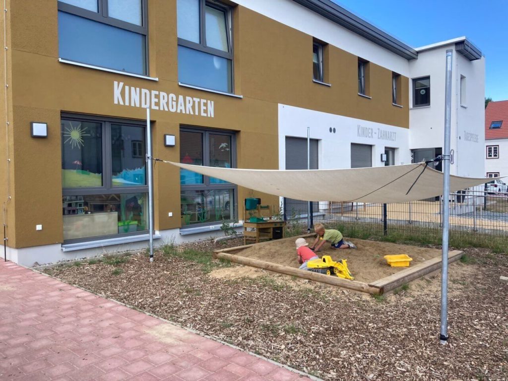Ein weiteres Highlight ist der stoffüberspannte Freisitz mit Tischen und Bänken. Hier wird gebastelt, gespielt, gelesen und auch gemeinsam gegessen – ganz nah an der Natur und geschützt bei jedem Wetter.