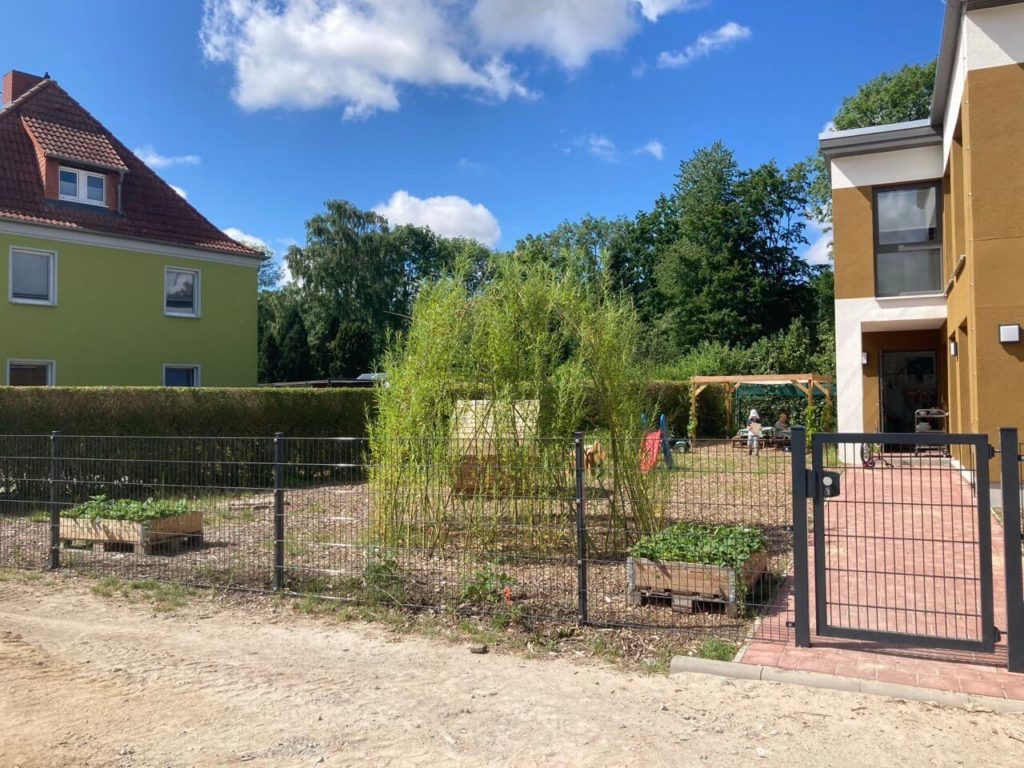 Heute, einige Monate später, zeigt sich: Das Gelände blüht auf. Der kleine Weidendom ist inzwischen gut angewachsen, grün und dicht. Er lädt zum Verstecken, Spielen und Ausruhen ein – ein lebendiger Rückzugsort und Schattenspender zugleich.