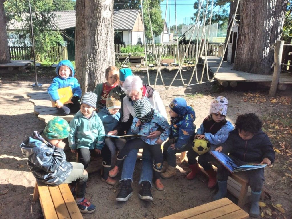 Jeden Donnerstag besucht unsere Märchenoma Birgit die Kinder der Ja-Naturkita Alte Stadtkoppel. Im Sonnenschein, zwischen Spielplatz und Bäumen, versammeln sich alle um sie – und lauschen gespannt, wenn sie ihr großes Buch öffnet.