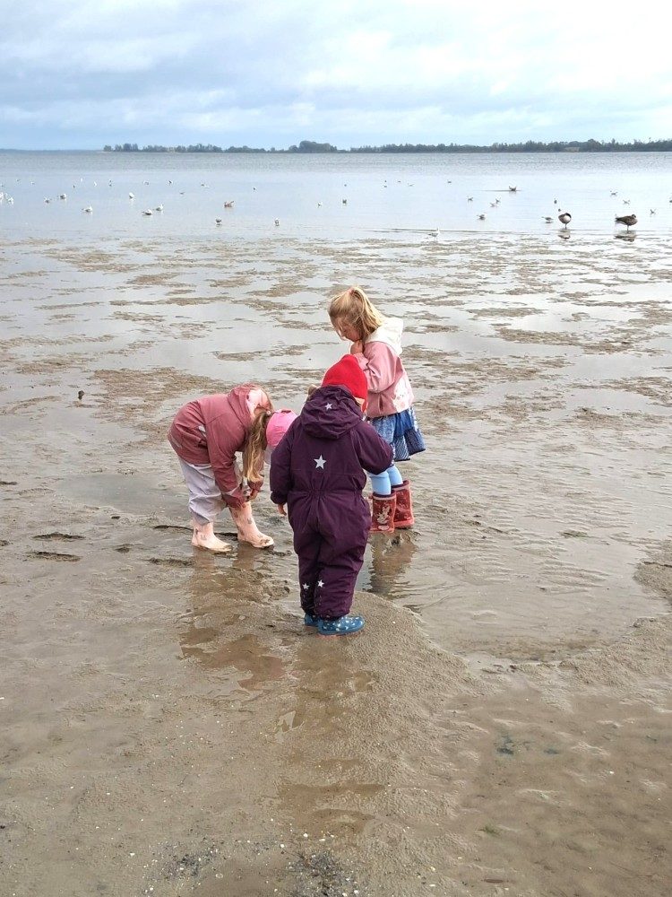 Der Wind pustete uns kräftig um die Ohren, und überall gab es etwas zu entdecken – Quallen, Muscheln, Seetang und sogar einen kleinen Strandkrebs! Ganz mutig nahm ein Kind sie vorsichtig auf die Hand, während die anderen staunend zusahen. Zum Glück hatten alle ihre Gummistiefel an – so konnten wir immer weiter Richtung Wasser stapfen, Schritt für Schritt, bis fast zur Kante.